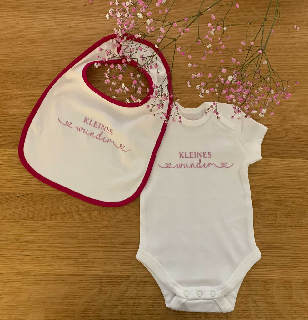 Body aus Bio-Baumwolle in verschiedenen Größen erhältlich, das Lätzchen ist auch aus Baumwolle und in verschiedenen Farben zu bestellen!