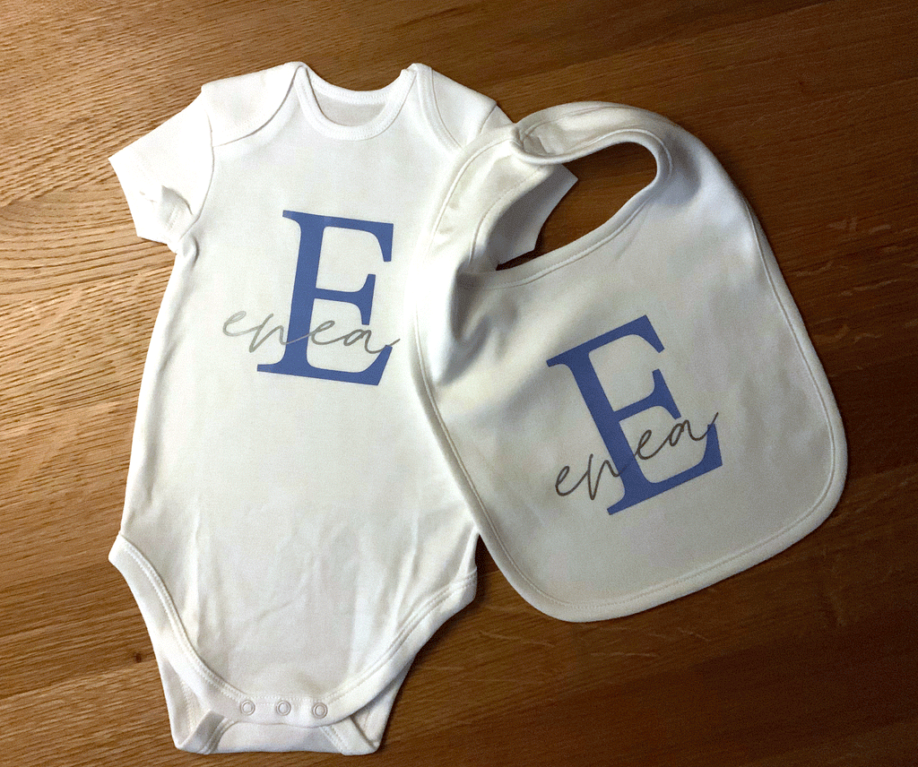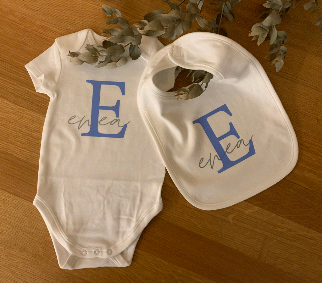 Body aus Bio-Baumwolle in verschiedenen Größen erhältlich, das Lätzchen ist auch aus Baumwolle und in verschiedenen Farben zu bestellen!