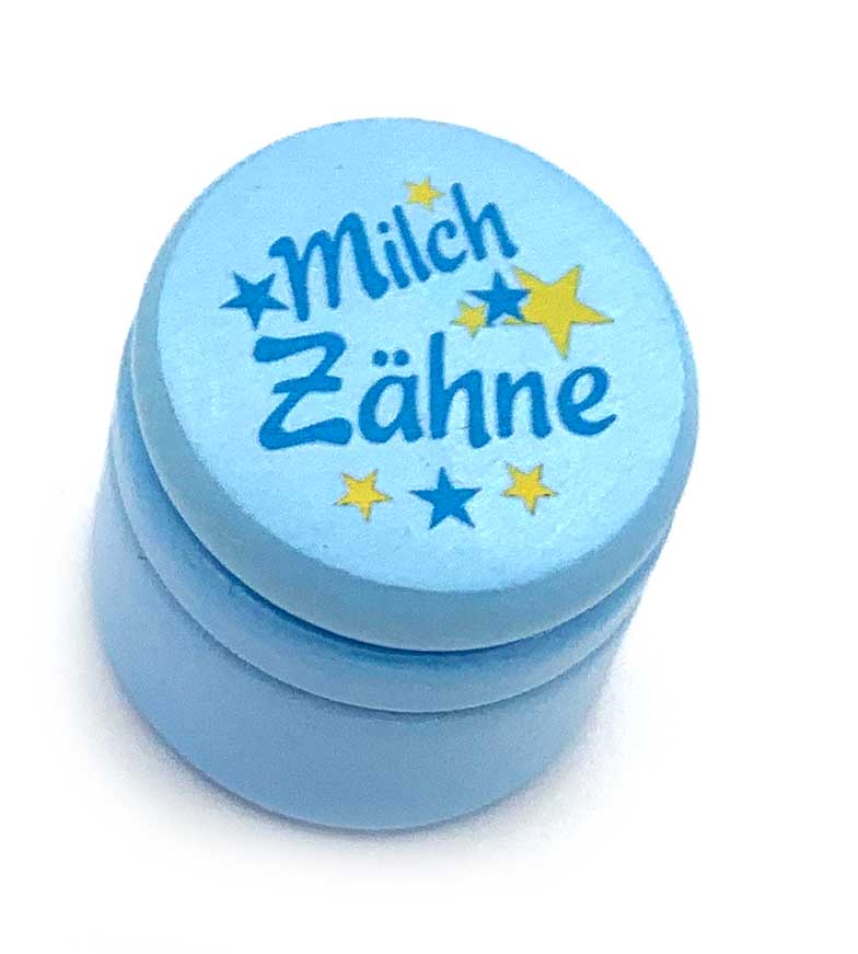 Die Milchzahndose hat einen Durchmesser von ca. 4 cm und einer Höhe von ca. 3,8 cm. Die Dose ist aus Vollholz und hat einen Schraubverschluss.