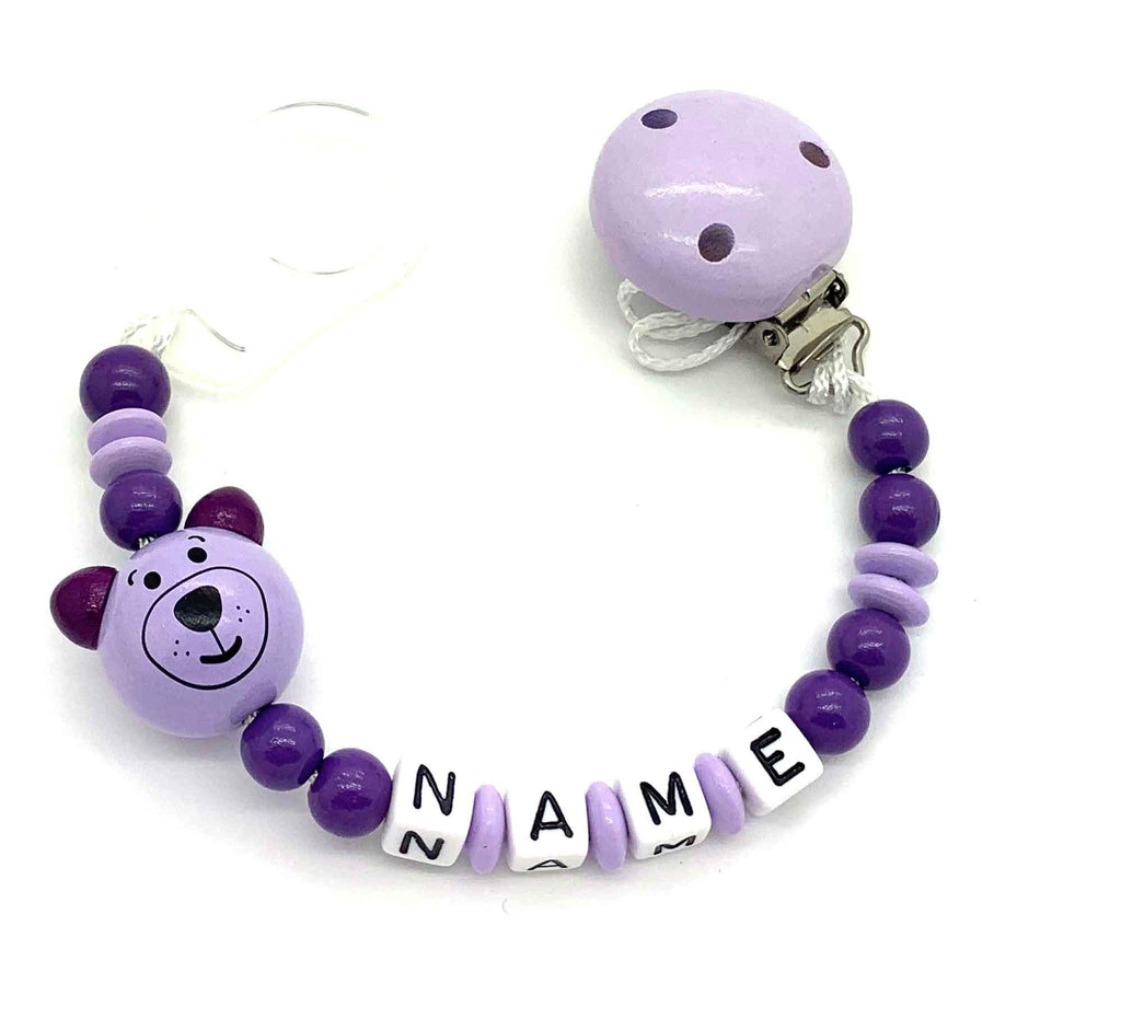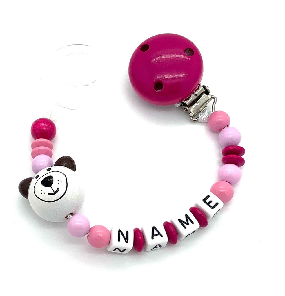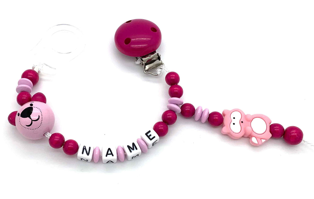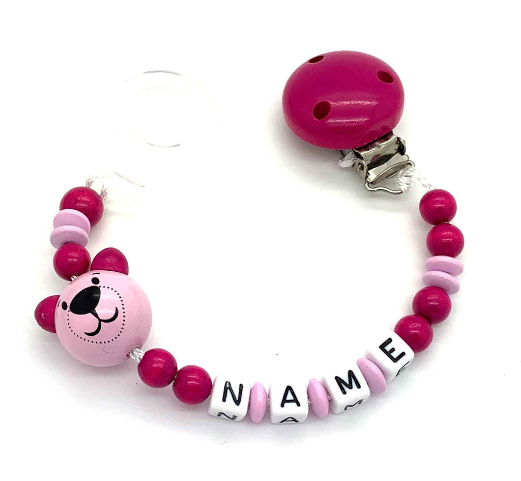 Die beliebte Schnullerkette mit dem 3D Bär gibt es passend für Mädchen und Bub.