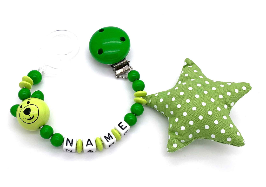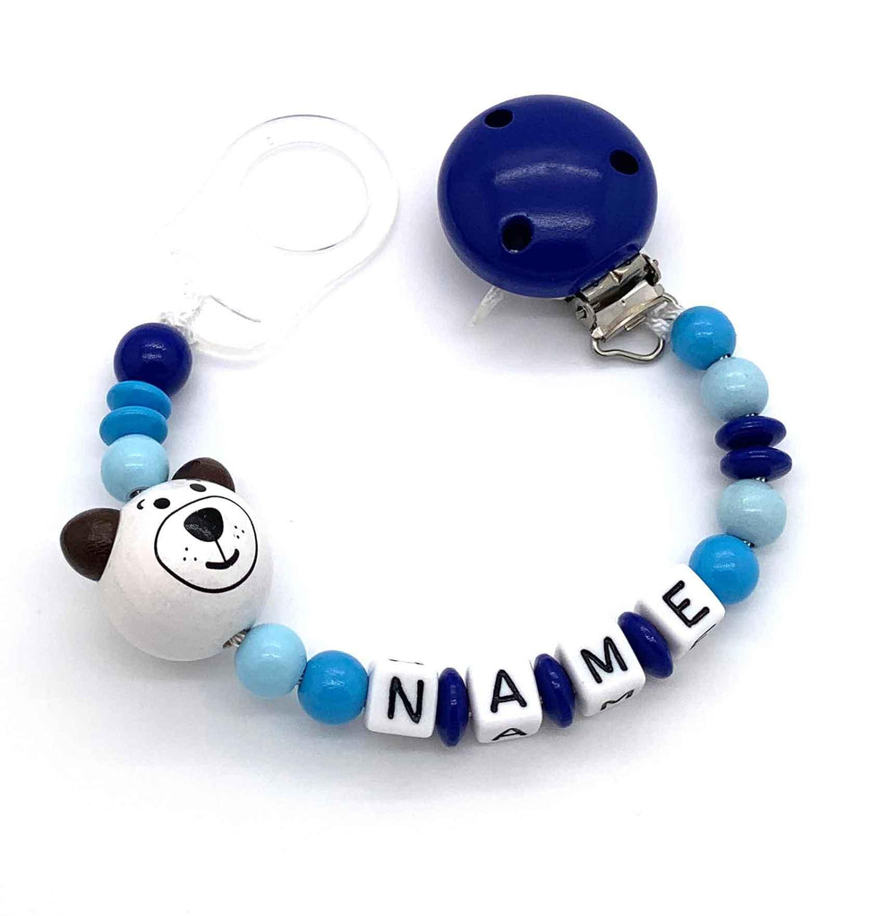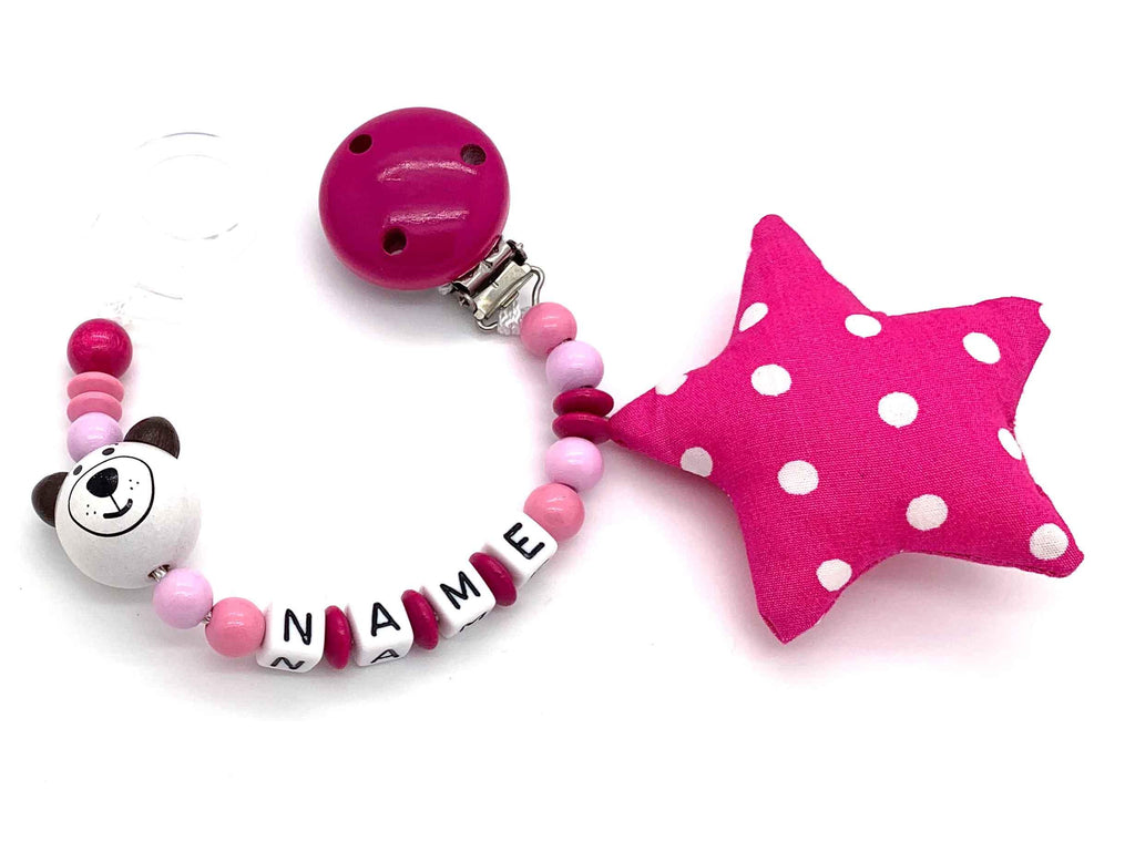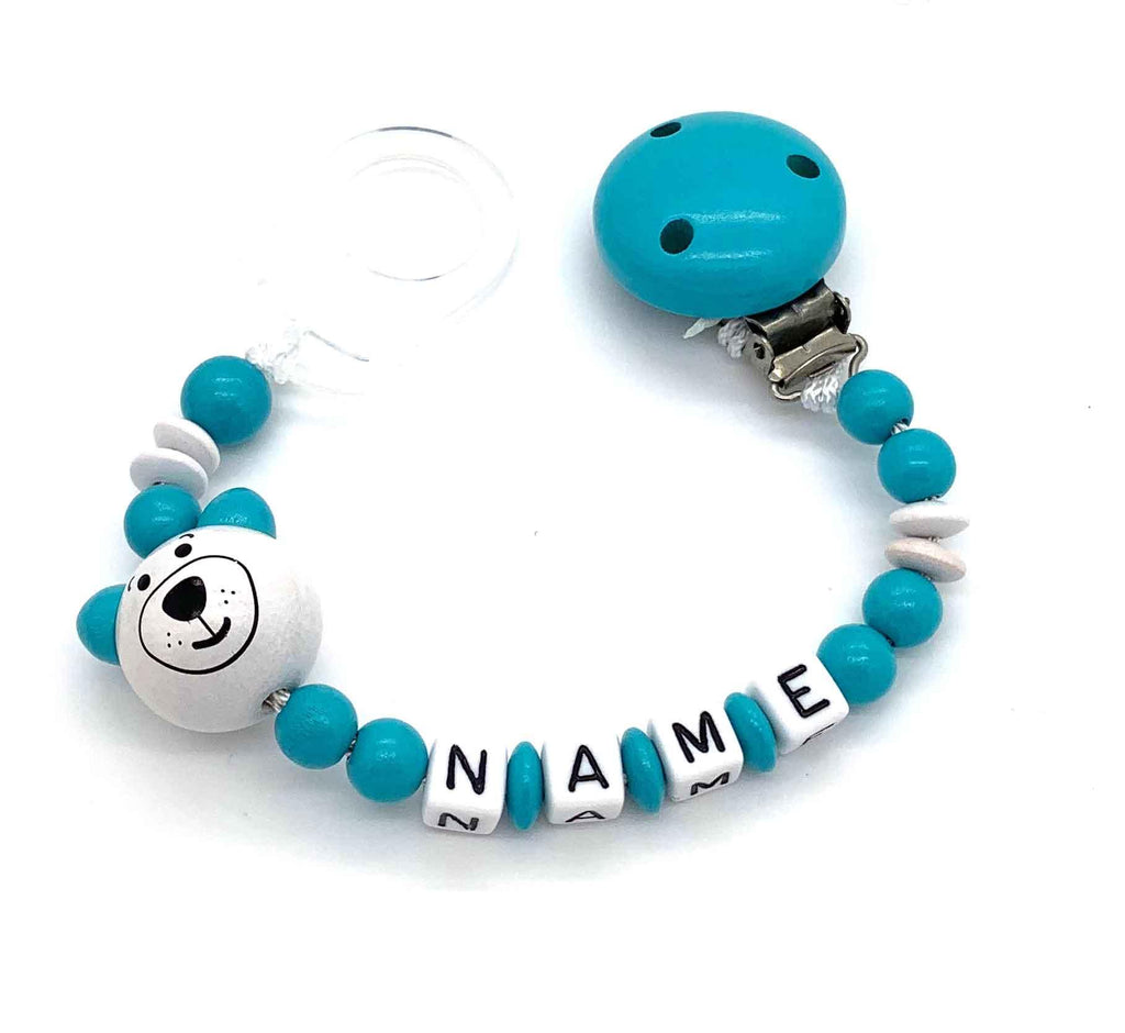 Die beliebte Schnullerkette mit dem 3D Bär gibt es passend für Mädchen und Bub.