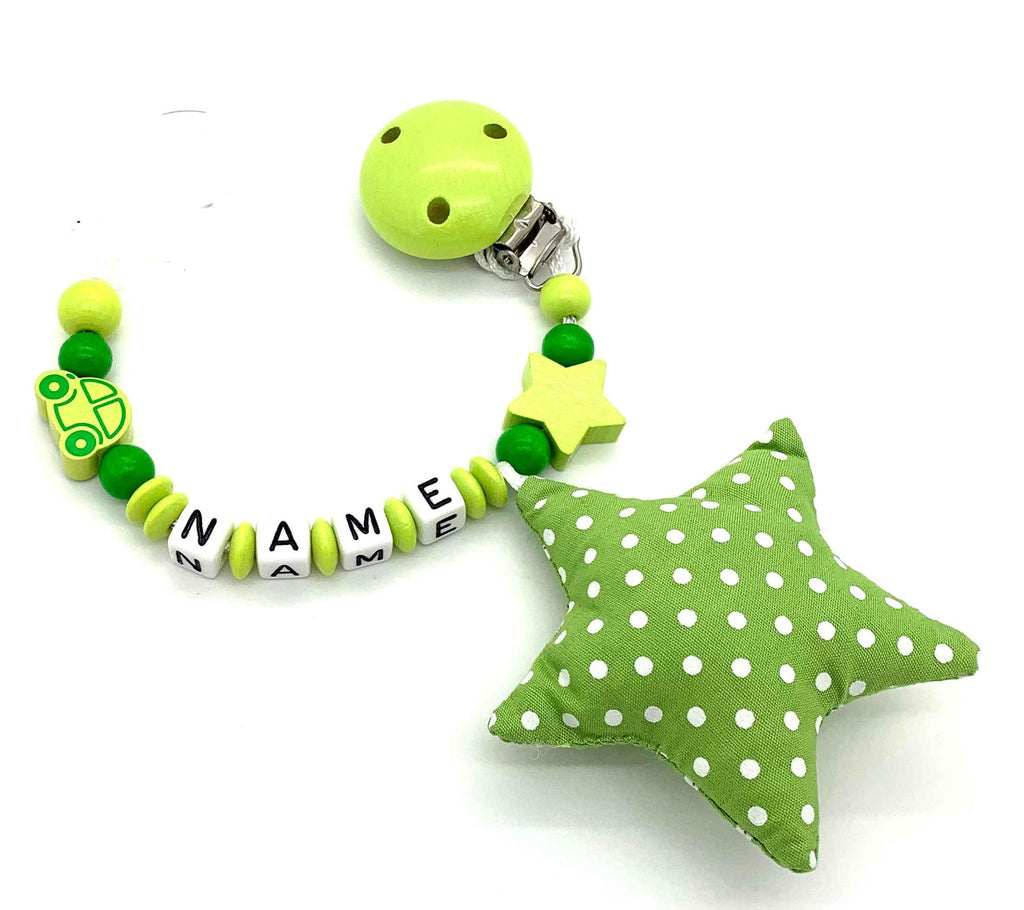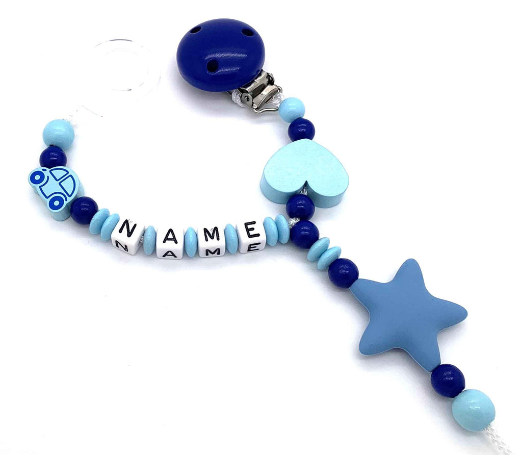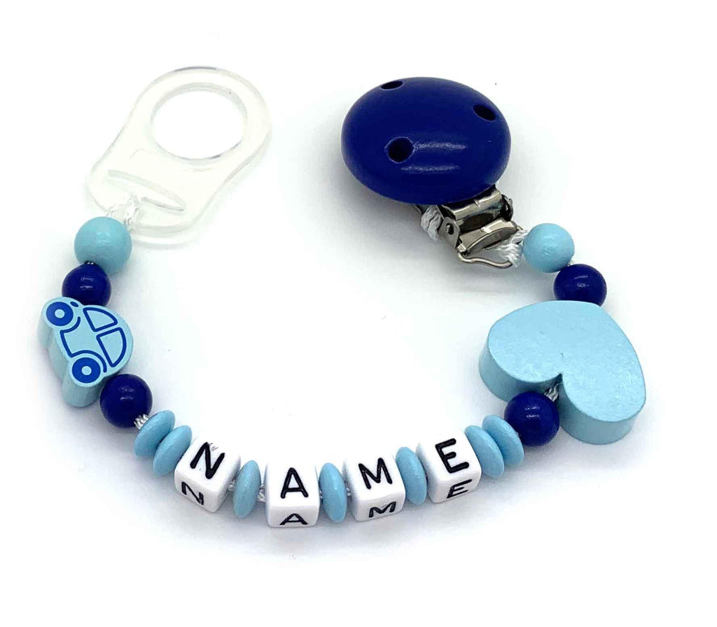 In blau und grün gibt es die Schnullerkette mit dem kleinen Auto.