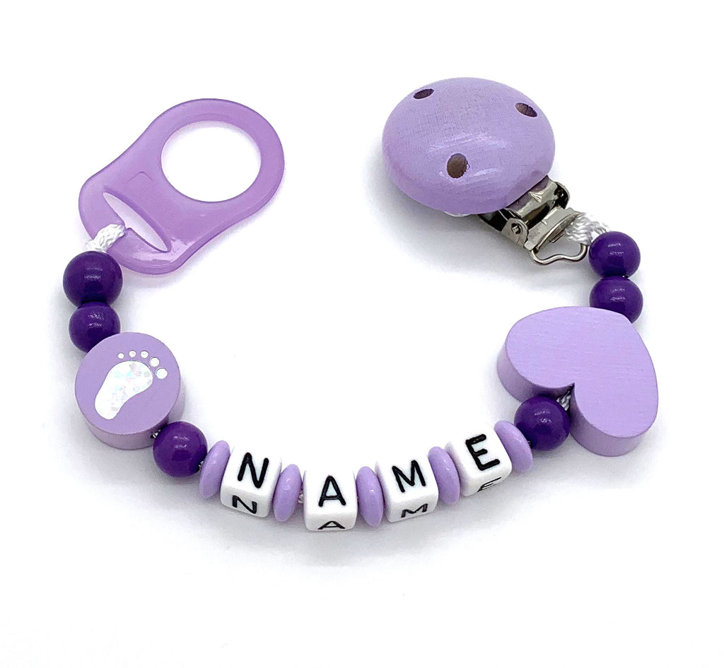 Der kleine Fuß auf der Schnullerkette mit Name ist in vielen Farben erhältlich.