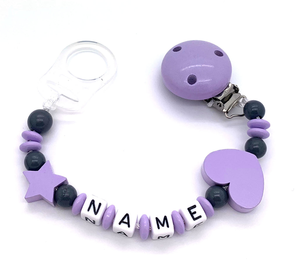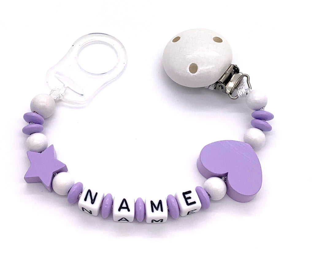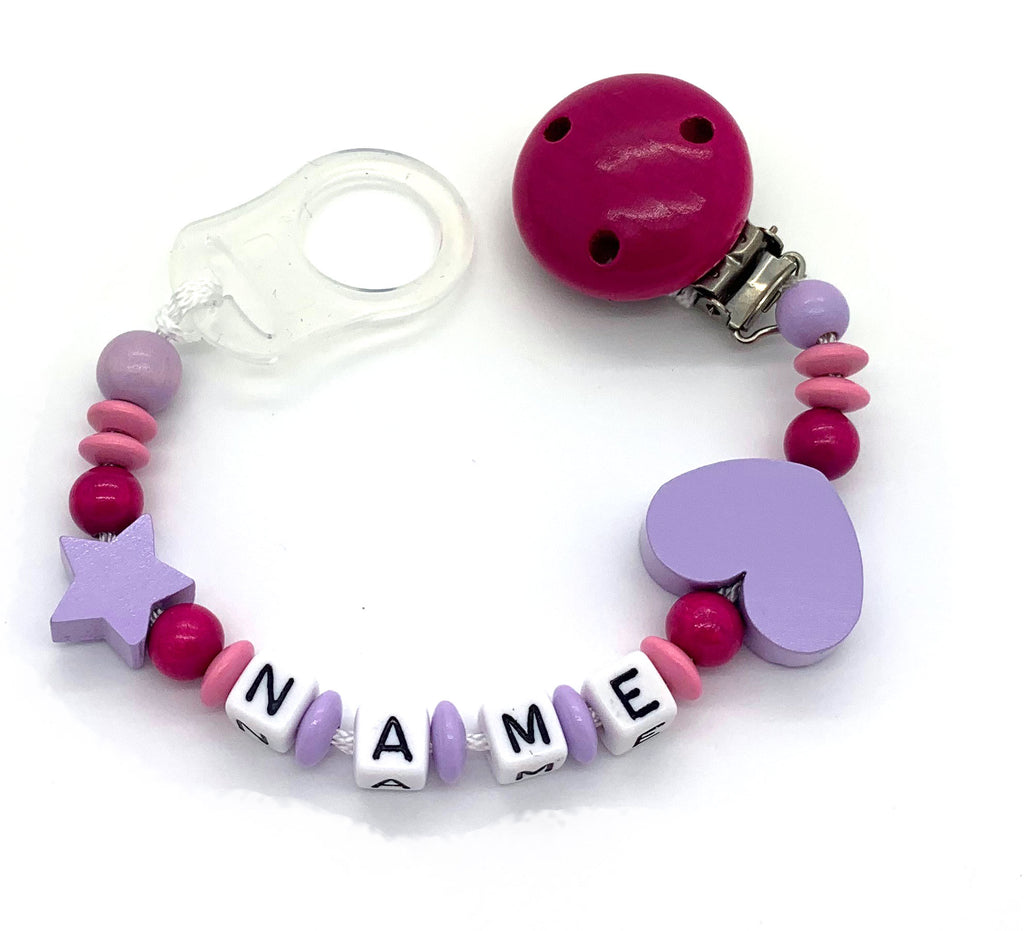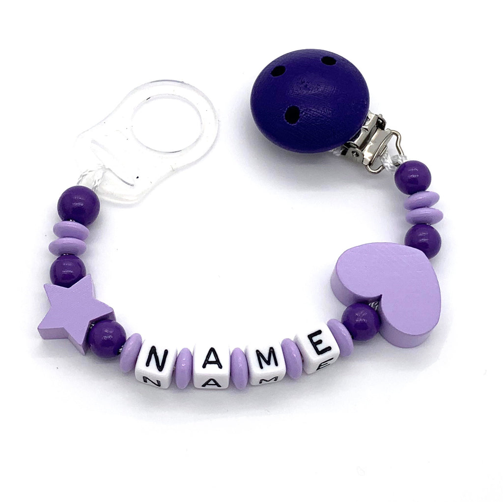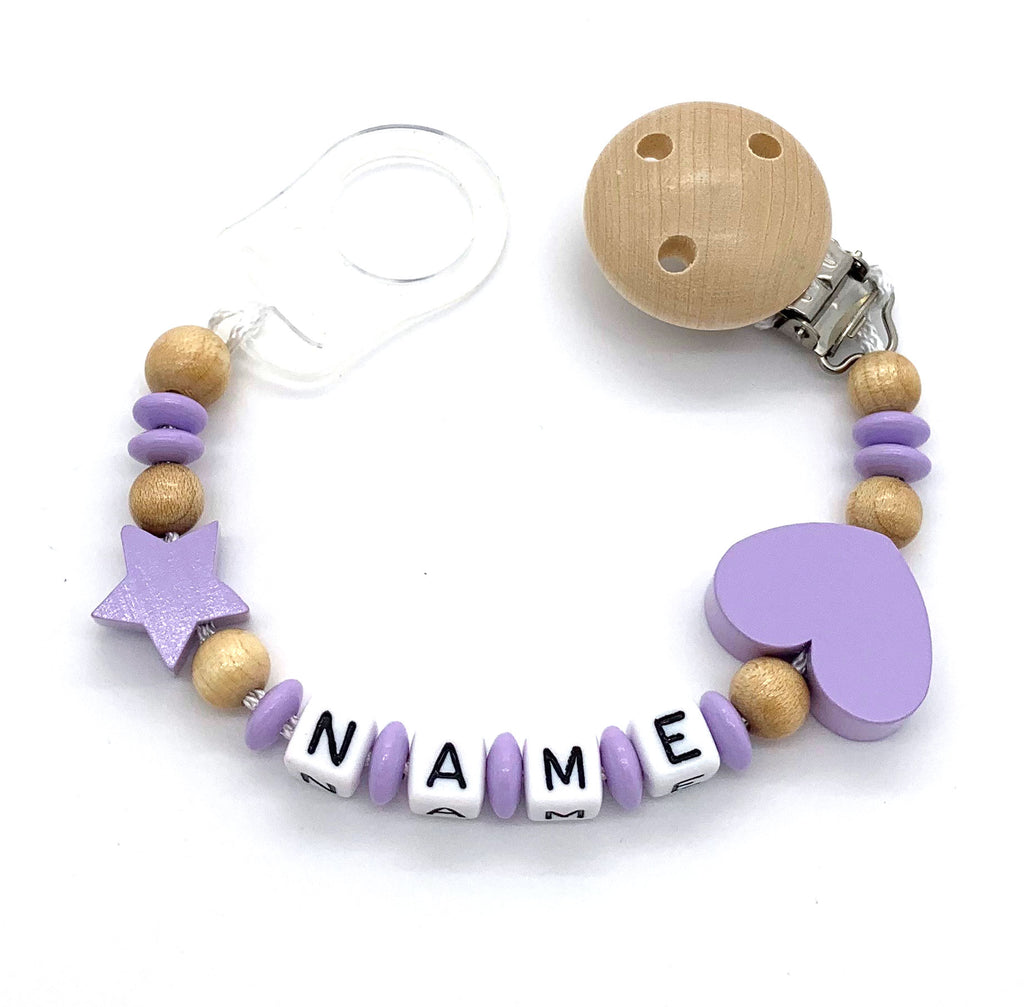 Schnullerkette mit Namen - Herz-Stern-flieder