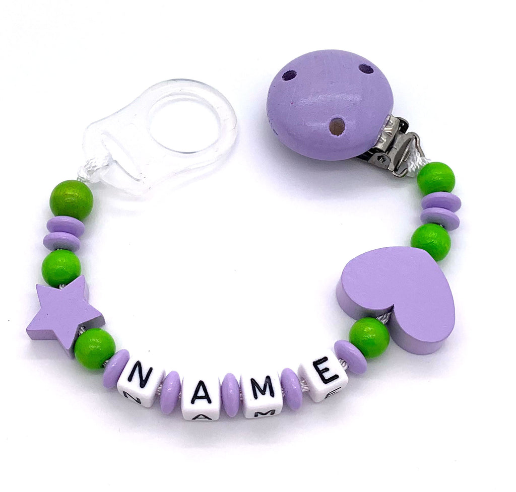 Ein flieder Herz und ein Stern schmücken diese Schnullerkette mit Namen. Man kann die Schnullerkette auch mit Stoffsternen oder Silikonanhänger gestalten.