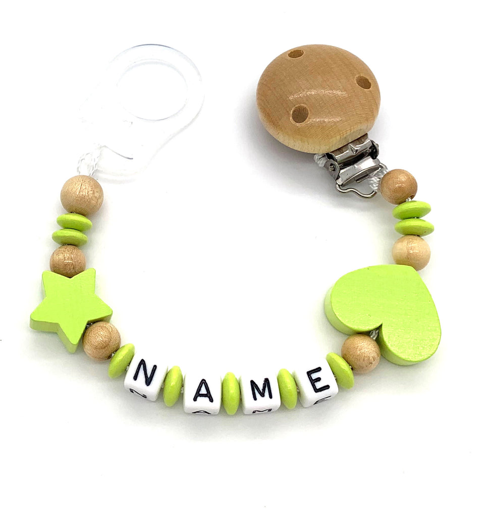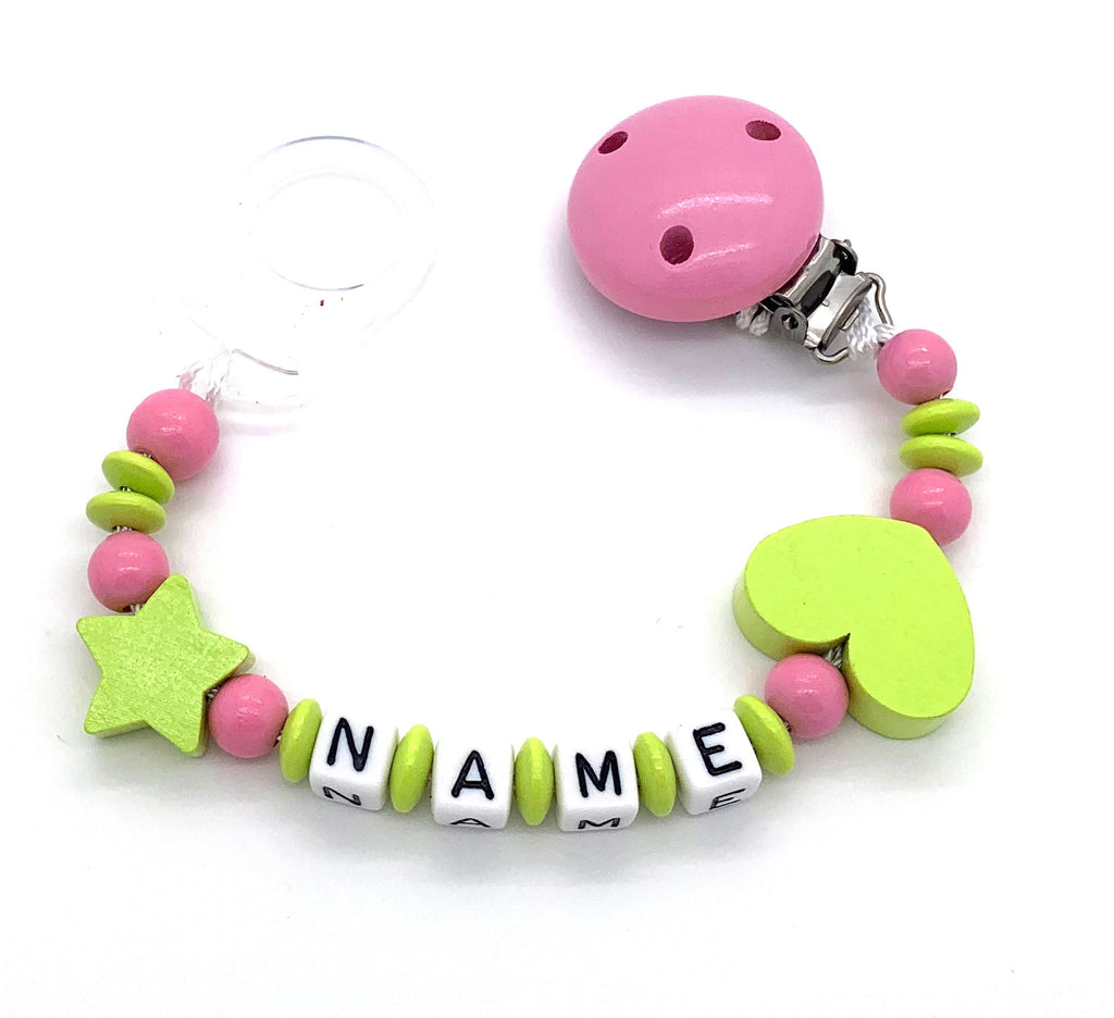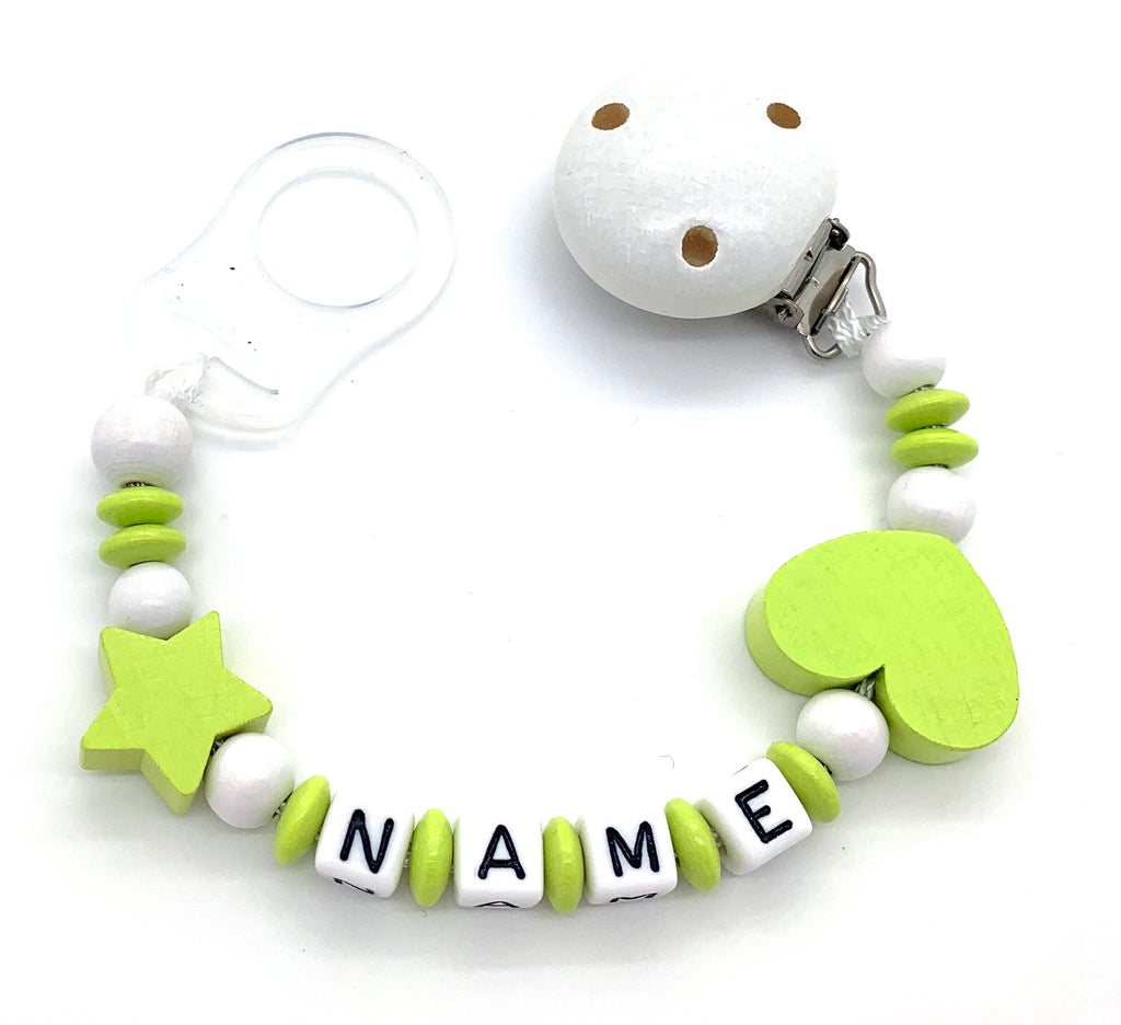 Eine Schnullerkette mit Name die für Mädchen und Jungs passt. Die Motive Herz und Stern in einem hellen grün gibt es in vielen Farbkombinationen.