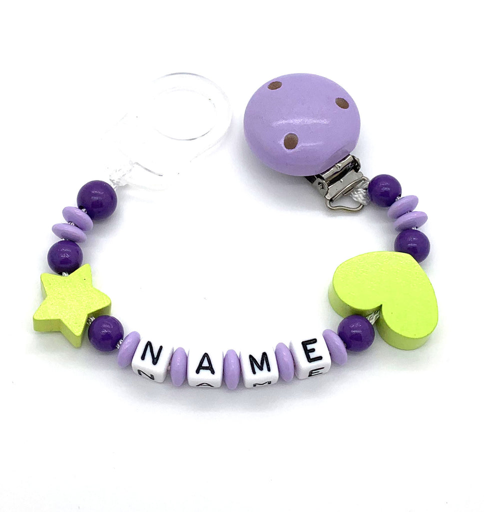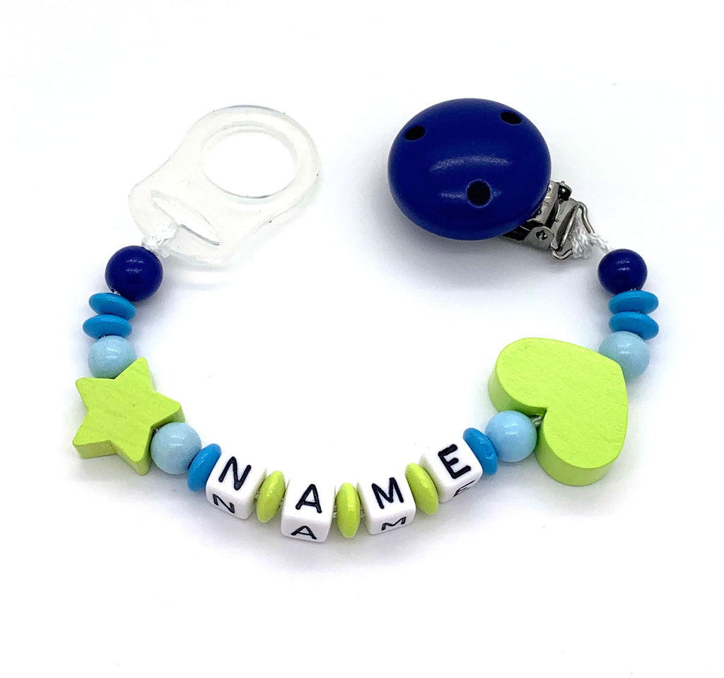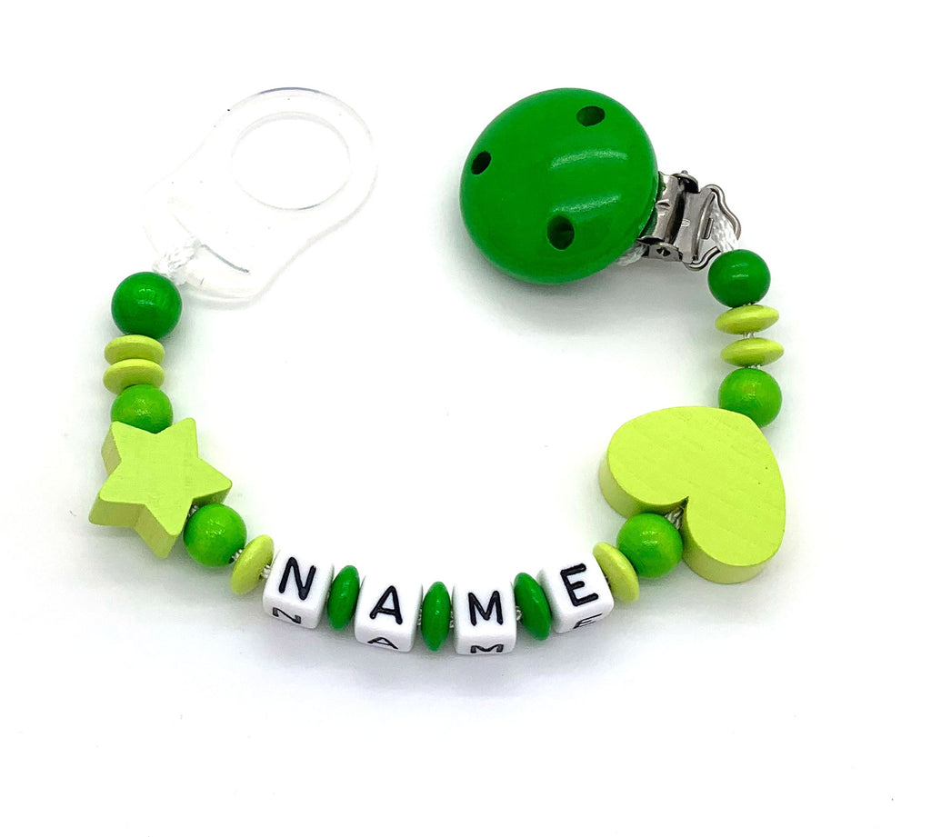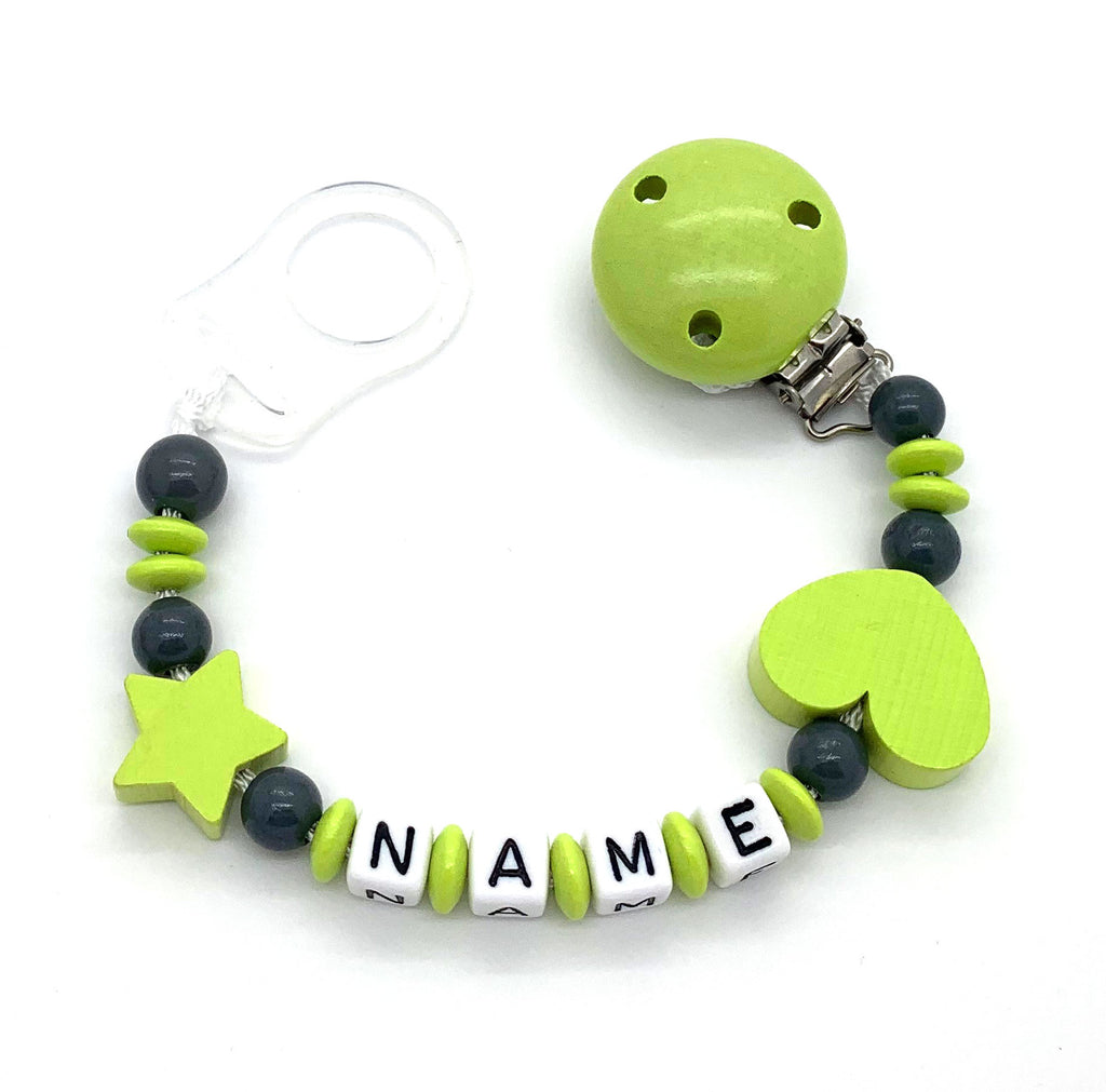 Eine Schnullerkette mit Name die für Mädchen und Jungs passt. Die Motive Herz und Stern in einem hellen grün gibt es in vielen Farbkombinationen.