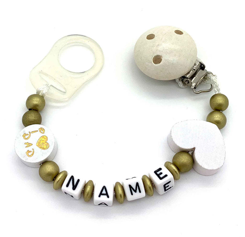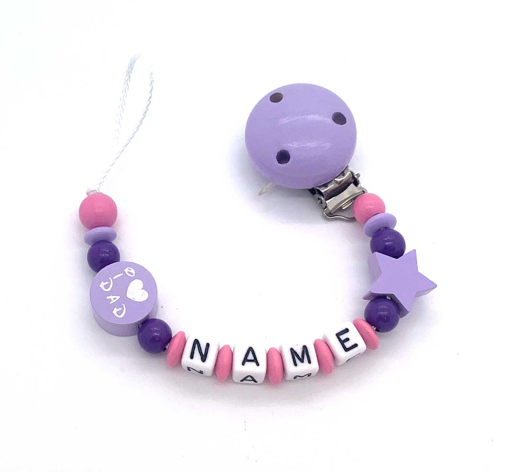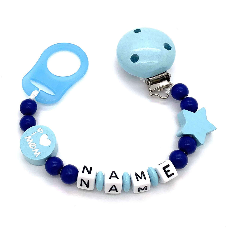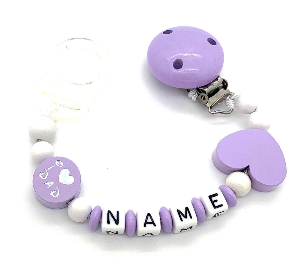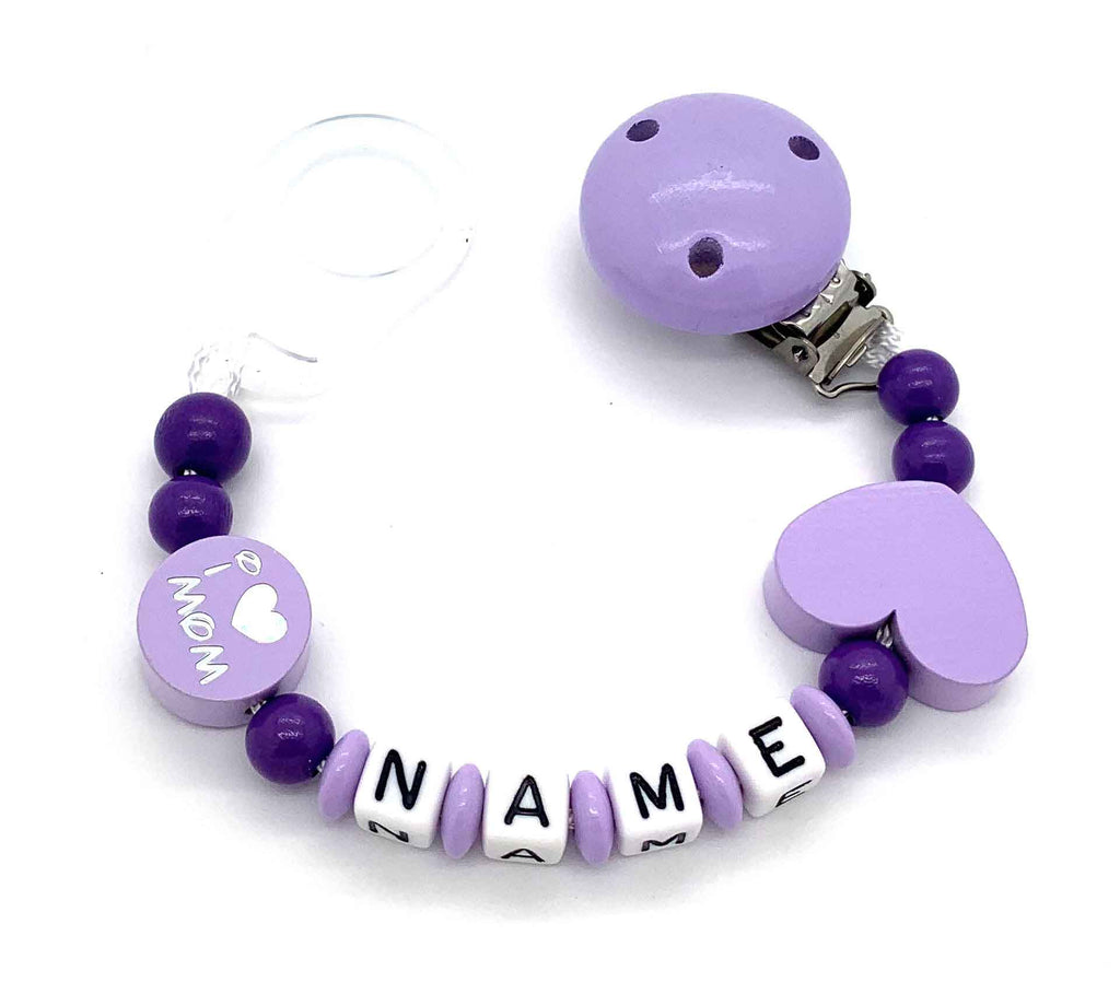 In vielen Farben gibt es die beliebte Schnullerkette mit Name mit dem Motiv I love Mom & Dad.